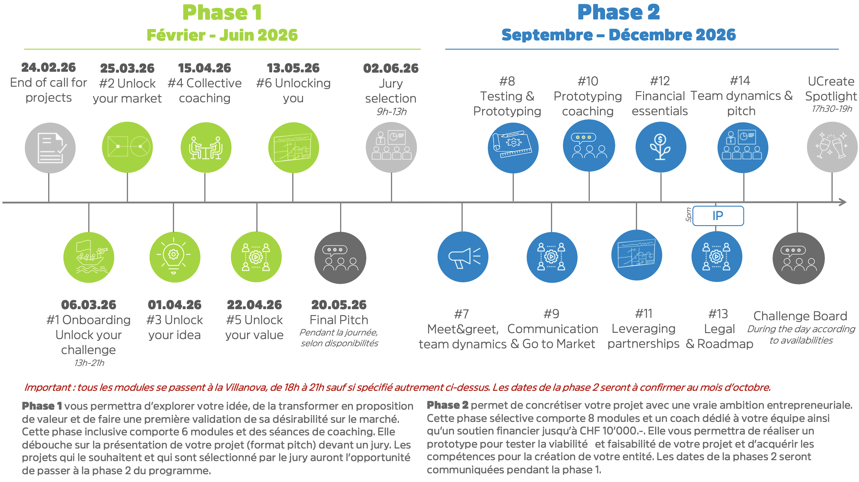 La phase 2 permet de concrétiser votre projet avec une vraie ambition entrepreneuriale. Cette phase sélective comporte 7 modules et un coach dédié à votre équipe ainsi qu’un soutien financier jusqu’à CHF 10’000.-. Elle vous permettra de réaliser un prototype pour tester la viabilité et faisabilité de votre projet et d’acquérir les compétences pour la création de votre entité. Les dates de la phases 2 seront communiquées pendant la phase 1.